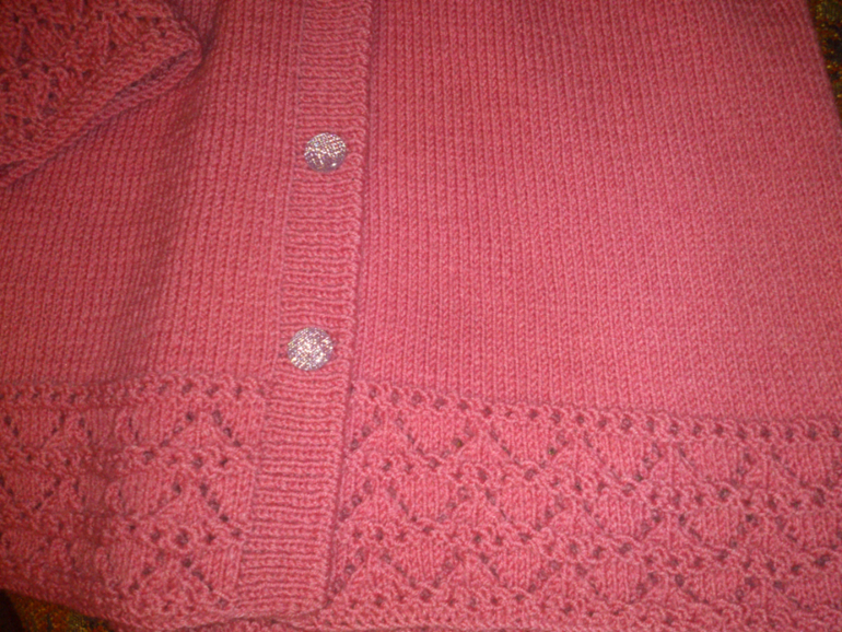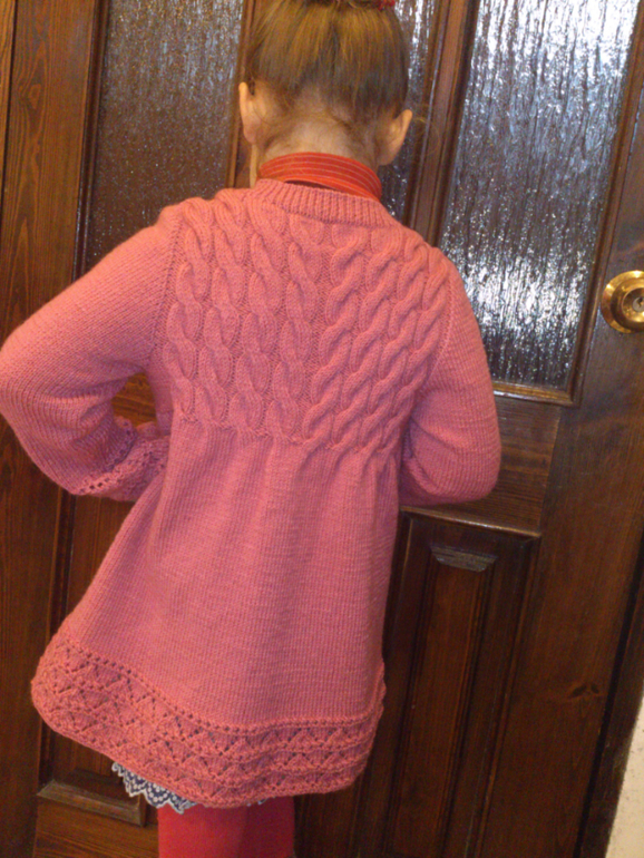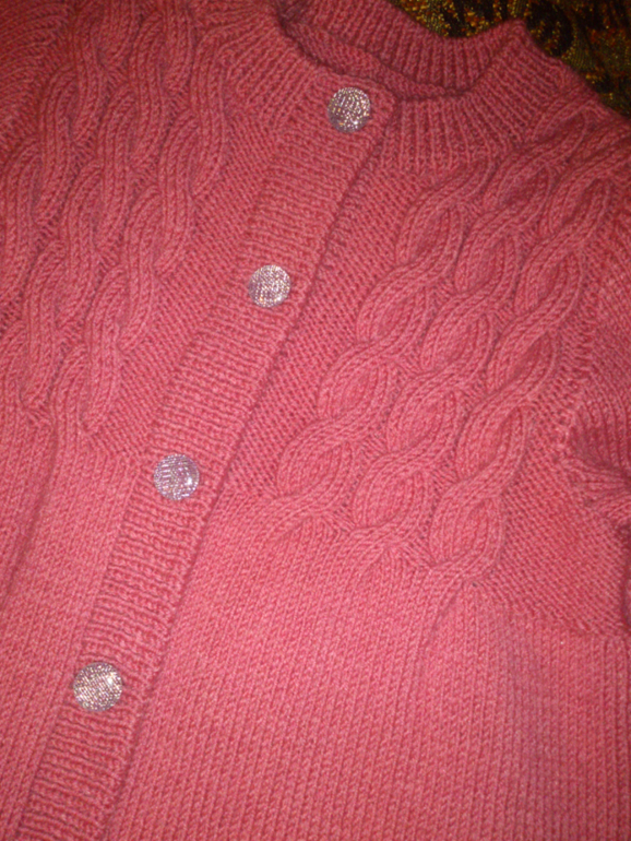 Очень красивый кардиган, а главное, что очень идет красотулечке! Цвет такой нежный, для девочки-девочки)))И вопросик можно?))) На кокетку переход с убавлениями или за счет кос эффект складочек? Загорелась идеей своей манюне на весну такой связать)))