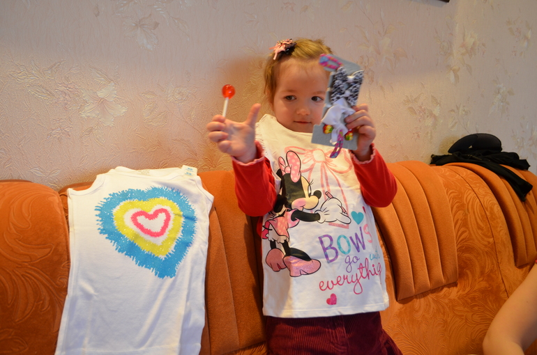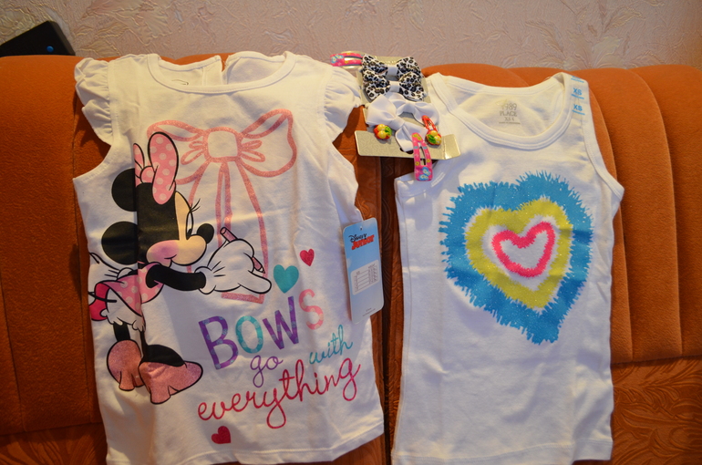 Подарочки для Насти! Маечка и футболочка с ее любимой минни!!! А еще резиночки и заколочки красивые! Майка и футболочка ооочень красивые, с блестяшками, но мой фотик отказывается фотографировать красиво((