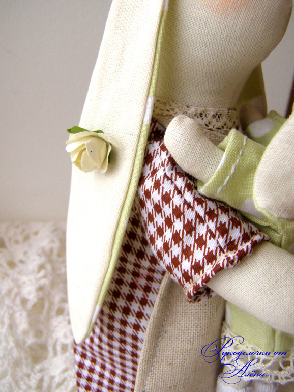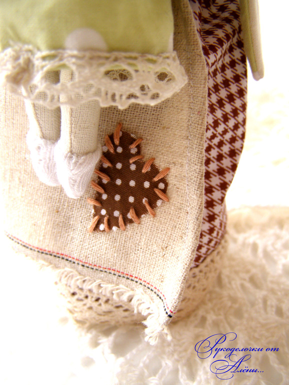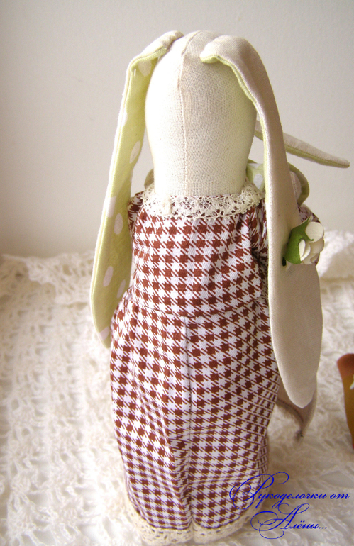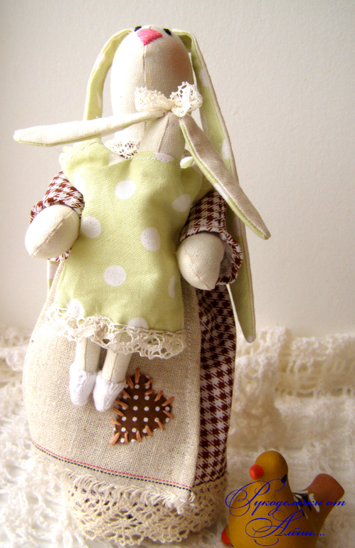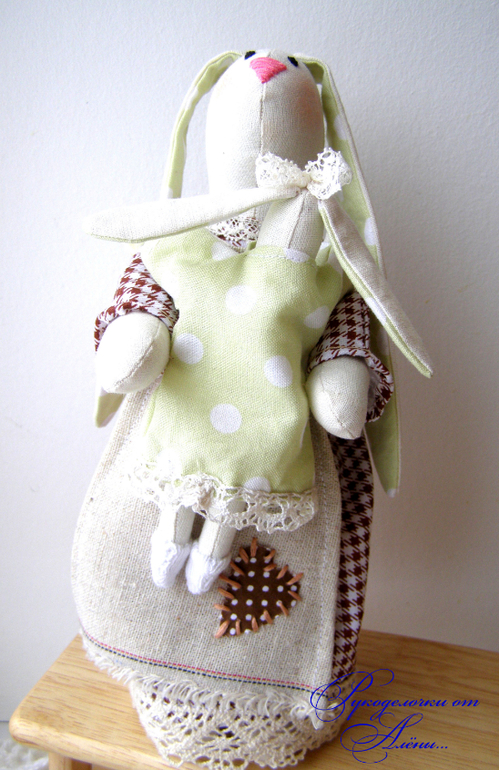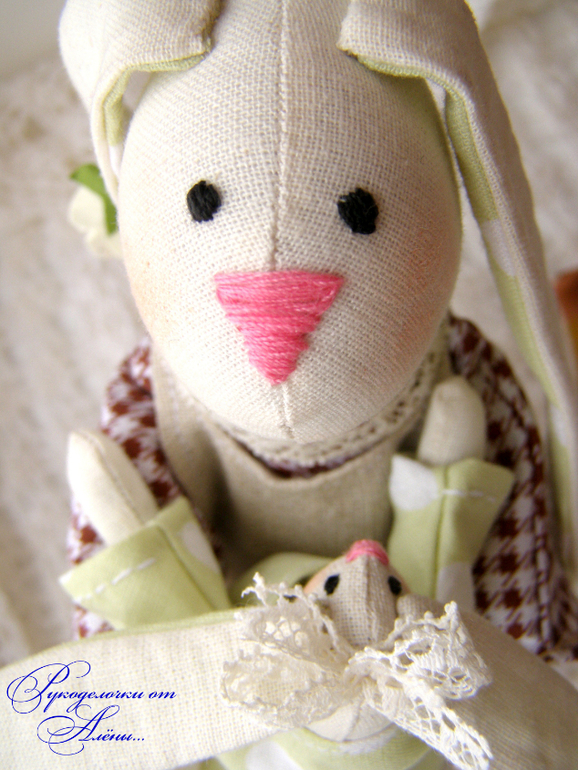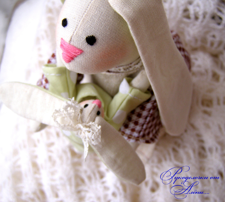 Игрушечный мир - животныеДавно мечтала сшить маму и дочку по всем известной выкройке. Только немного смущало, что у Зайки-мамы ножек нет, а тело в форме столбика плотно набитого. Поэтому решила сшить всё-таки по-своему..с ножками)). Зайка - мама -милая, домашняя, уютная, самостоятельно сидит и стоит уверенно на ножках,вислоухая. Держит на ручках малышку-дочку.Зайки сшиты из натуральных тканей: небеленного хлопка и льна, украшены льняным и хлопковым кружевом.Мама-23см, доча-12см.