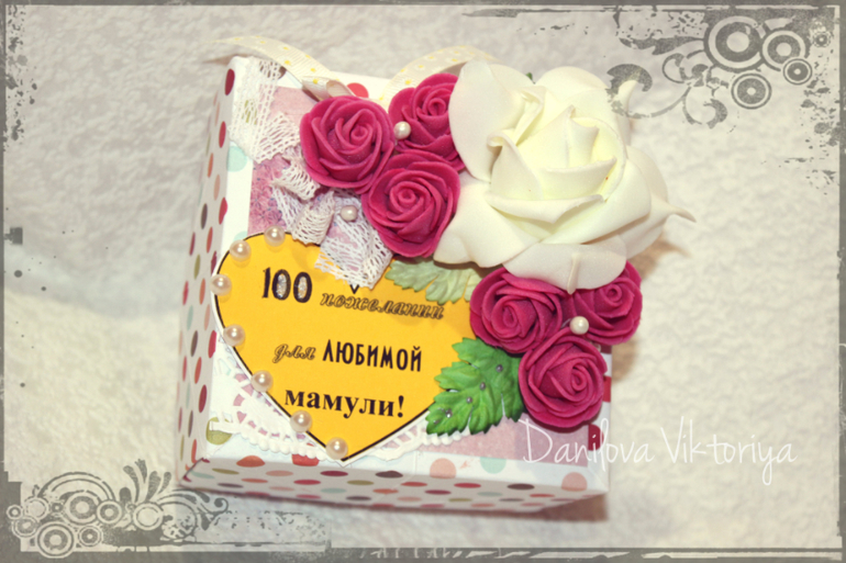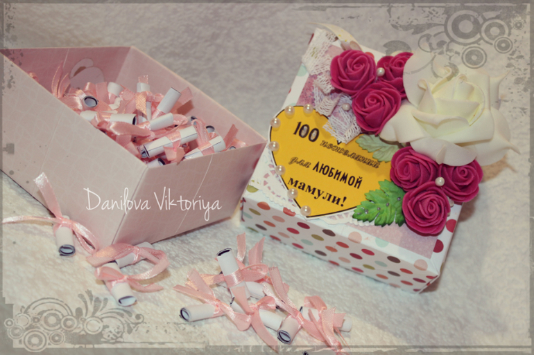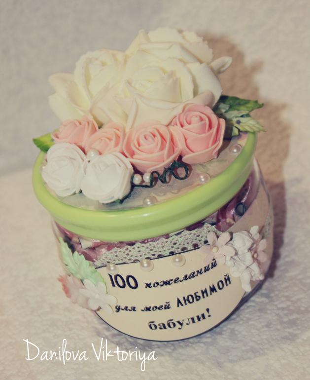 А это коробочка и баночка "100 пожеланий для мамы и бабушки" И одна "100 причин, почему я люблю тебя" для парня. К сожалению заказчица так и не забрала их, чем очень меня подвела, т.к. предоплаты с нее я не взяла!