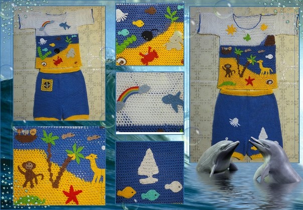 Я рисую море)Нитки сосо, расход 200 гр. крючок 2, на 1 годик(рост 80 см), окружность головы 46 см.