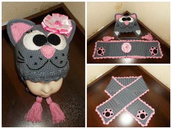 Комплект "Кошечка",шапочка о. г 48, шарф 12,5*107 см. нитки Пряжа Ализе Беби Вул (шапка в 2 нити +флисовый подклад, шарф в одну).