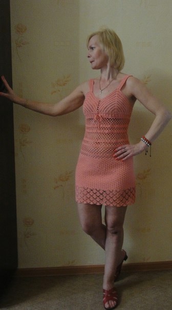 Связался вот такой сарафан. Нитки бегония, цвет лосось, крючок 2,5, размер 40-42.