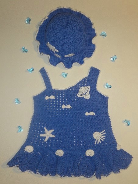Комплект"Колокольчик".Для панамки нитки Розе, Анна 14, платье вязать не успевала, купила готовое и просто обвязала низ и связала украшение-колокольчики.