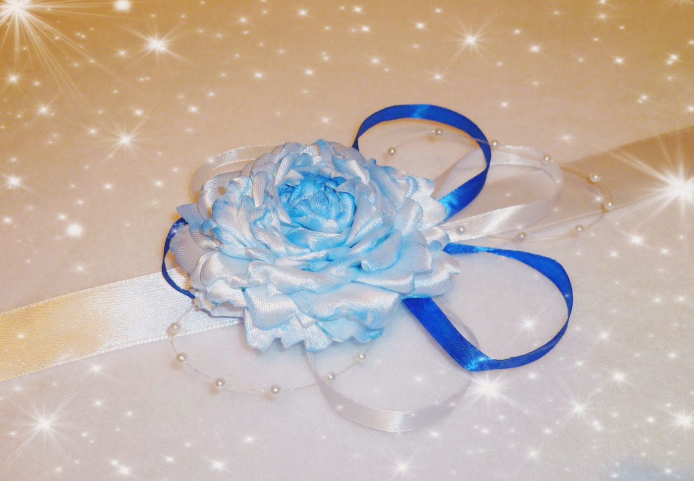 Я сделала бутоньерки для подружек невесты в виде розы. Цвета свадьбы- белый и синий.
