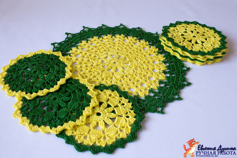 Есть у нас друзья, которые наконец-то доделали ремонт в своем новом доме. И, поскольку нас пригласили на новоселье, связался у меня такой вот набор - одна большая салфетка и девять штук маленьких. Скажу, что давно я не вязала с таким удовольствием, поэтому надеюсь, что и будущей хозяйке набор тоже понравится.