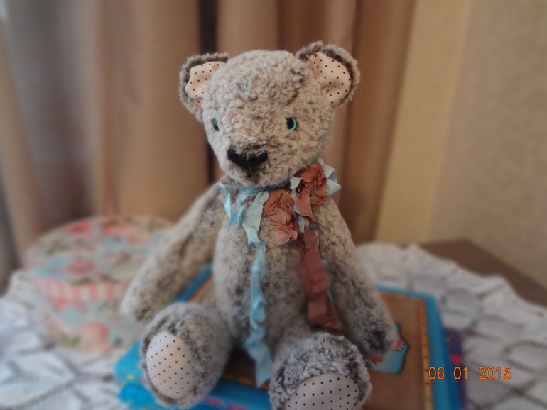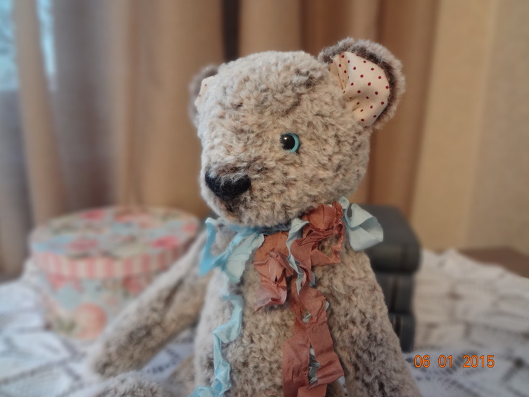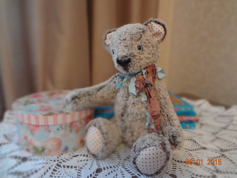Игрушечный мир - животныеМишка сшит из искусственного меха,набит плотно синтепухом,утяжелен гранулятом. Голова на шплинтовом креплении,ручки и ножки на пуговичном. Украшен мишка шебби лентами. Мишка такой мягенький на ощупь,приятно держать в руках)))