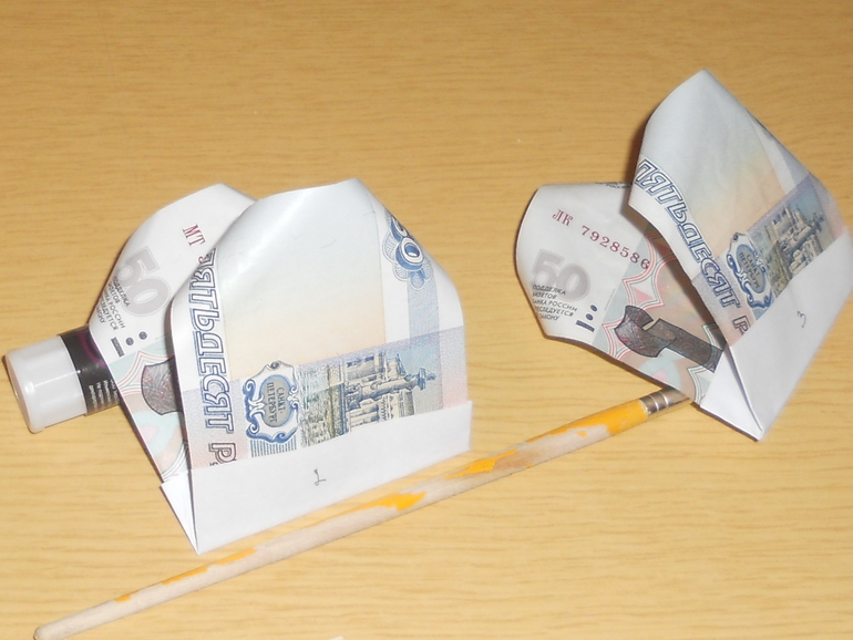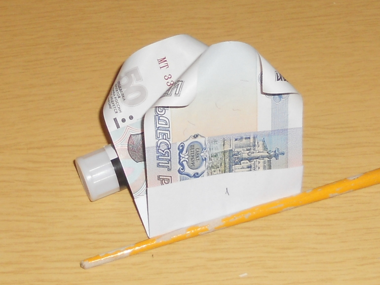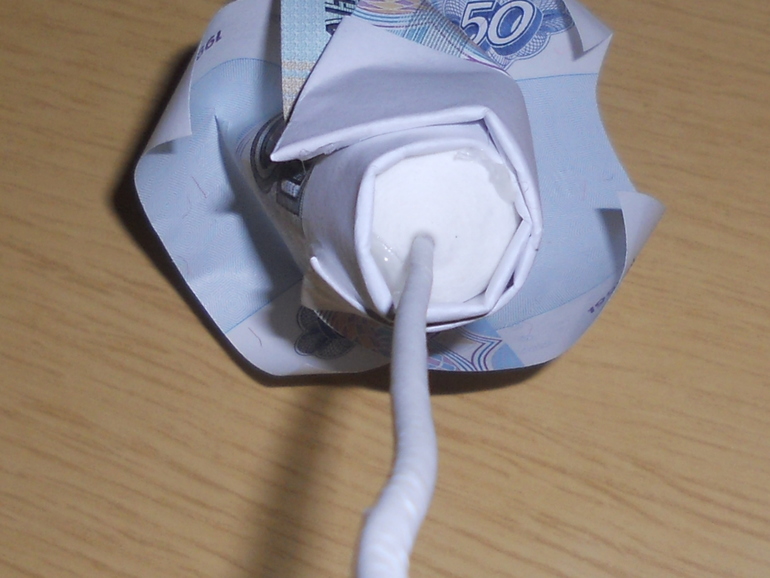 кончики первой купюры сворачиваем, у меня это кисточка, одни внутрь другие наружу
