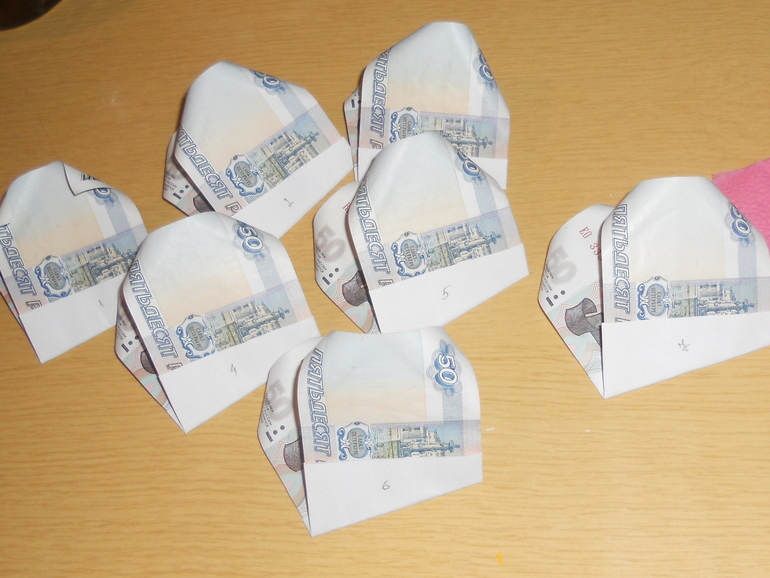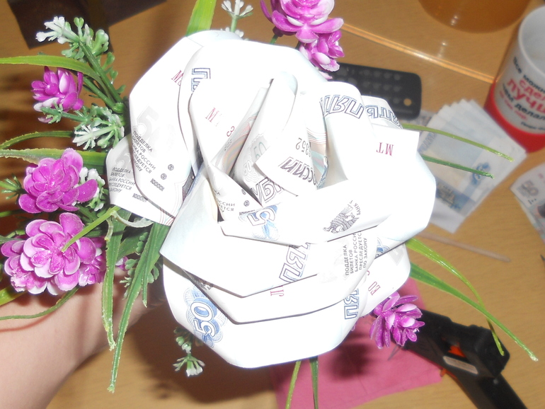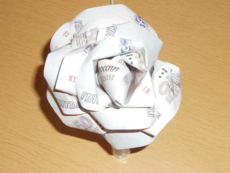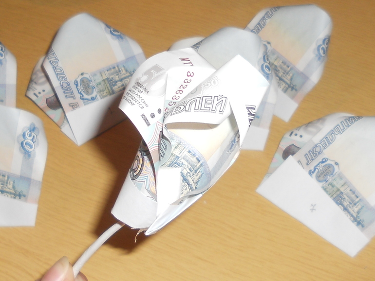 на одну розу уходит 7 купюр но тут по желанию. Каждую купюры складываем под разными углами, у первой совсем маленький наклон у последующих все больше и больше