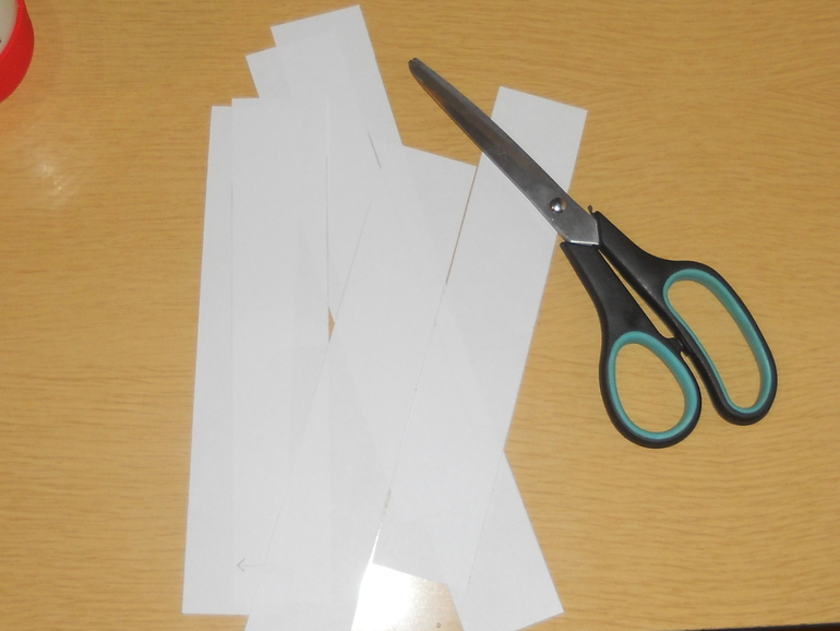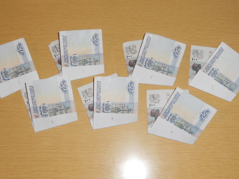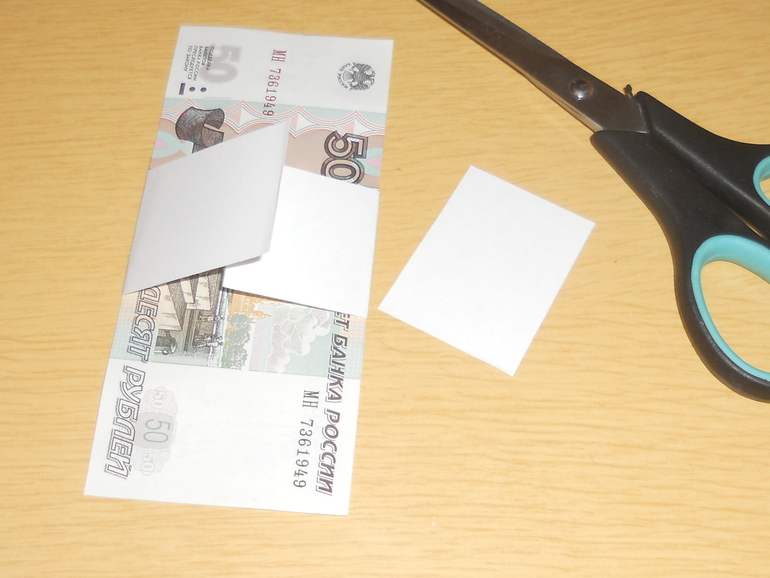 оборачиваем полоску вокруг купюры, оставляя немного места для склейки краев, остальное отрезаем