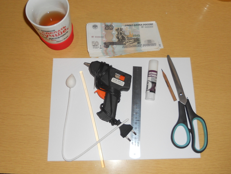 нам понадобится: клеевой пистолет, клей, линейка, ножницы, карандаш, клеевой карандаш, купюры, заготовка для розы (я покупала в Леонардо) листы А4 и конечно чай