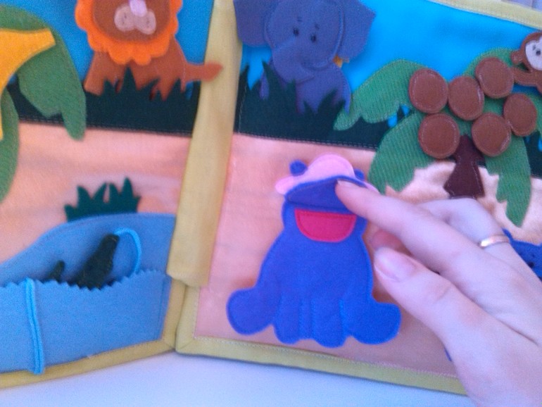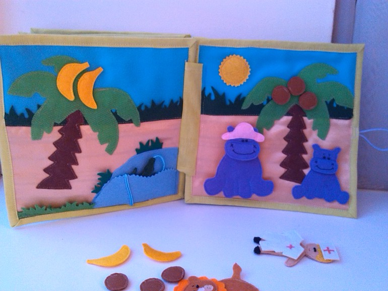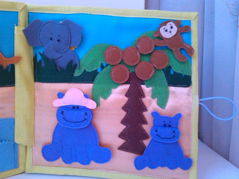 6. Африка. К развороту сшит кубик из фетра с цифрами, в кадр не вошел. Учимся сравнивать количество бананов кокосов на пальмах.