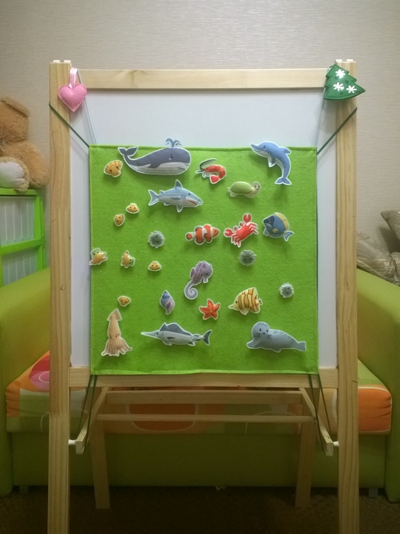Спасибо большое!!! Основа с одной стороны из грубого Корейского фетра (он подходит для игр с липучками), толщина примерно 1,2 мм, а с другой стороны более темный тоже грубый только 2 мм. Морские жители — это принт-ферт (честно говоря не знаю как он по другому называется). Сама недавно открыла его для себя. Вырезать и сшить, а основу под него брала 2 мм фетр белого цвета + решила набить чуть-чуть. Зверушки на липучках. Держатся не плохо, но думаю, что нужно еще попробовать купить отрезок ковролина. На обратной стороне ковролинографа планирую пришить пуговки, как на елочку, и нашить туда разных игрушек. Надеюсь, что я нормально все изложила.
