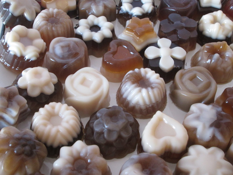 Заказ для свадьбы - 50 мылок-шоколадных конфет (будут раздавать гостям в качестве сувениров такие мешочки с монеткой и мылом). Три вида "шоколада", ароматы - шоколад, кофе, миндаль, вишня в шоколаде. Пахнут на всю квартиру!