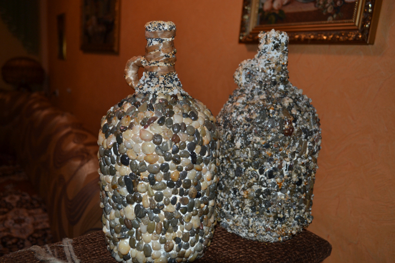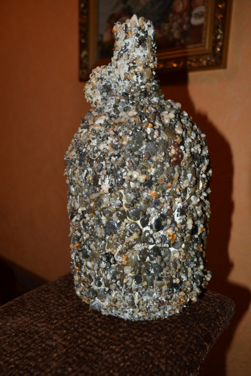 Декор, витражи.Мое увлечение бутылочками продолжается (звучит так, как будто бы я пью!!)) на этот раз бутылку декорировала галькой. свекровь из Судака привезла много гальки. "Клеила" гальку на шпаклевку, затем покрыла лаком. И вот что получилось