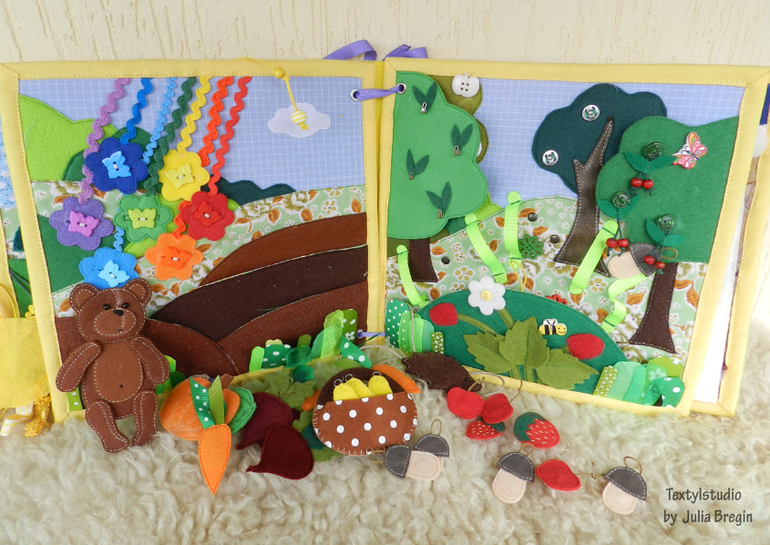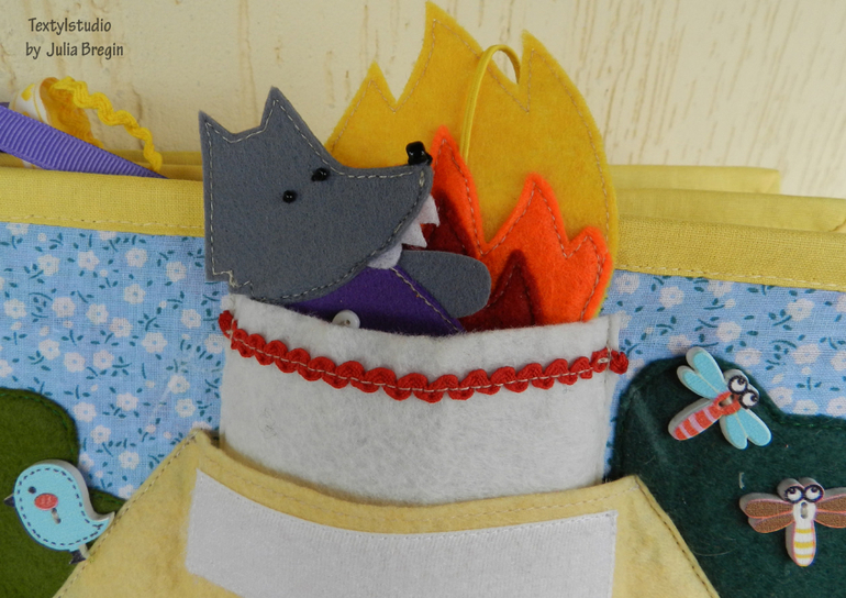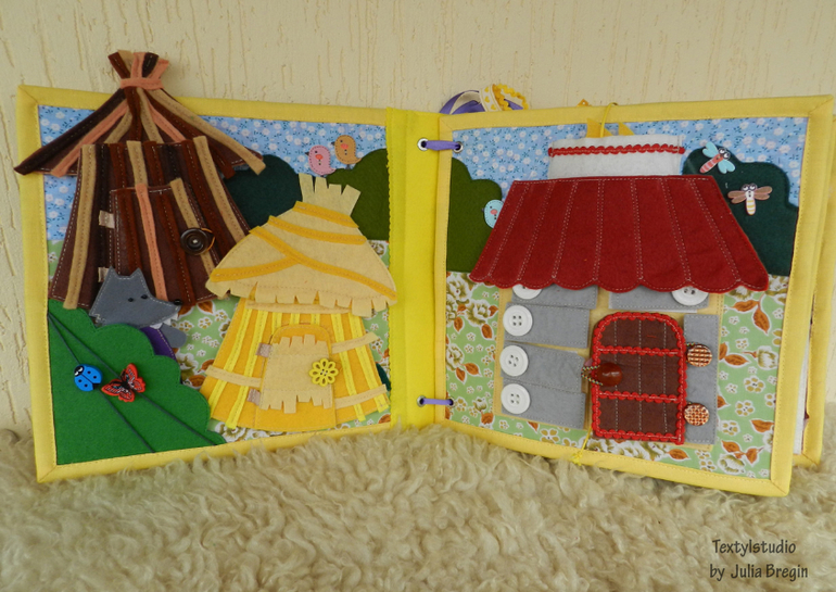 Сказка про трех поосят, в домиках снимаются крыши, открываются дверки, потом волк сдувае и сами домики, каменный можно строить, все на липучку.