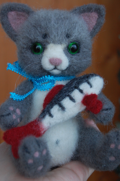 Фелтинг (валяние шерсти)Сваляла котёнка в человеческой позе. ) Маленький - 13 см, зато с рыбкой. )