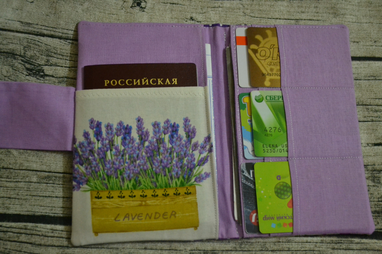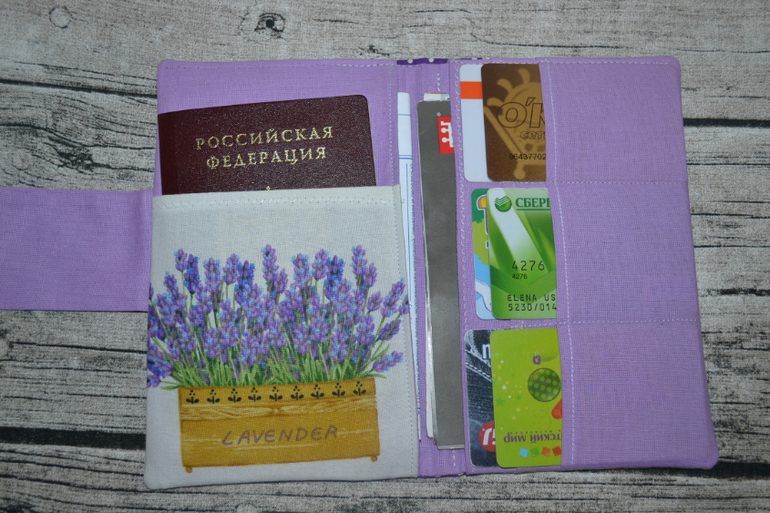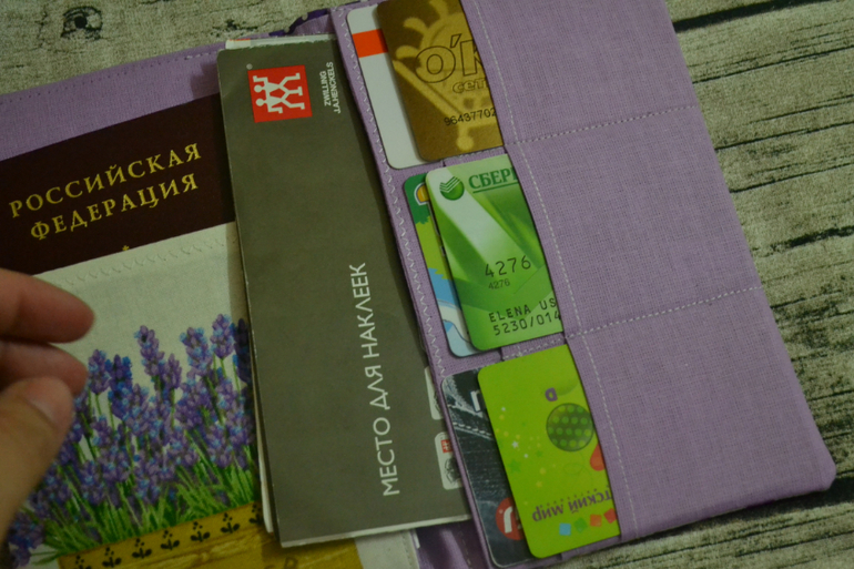 В нем получилось целых девять отделений - 6 для пластиковых карт, 1 для паспорта и два больших, для дорожных карт, билетов и прочих нужностей!