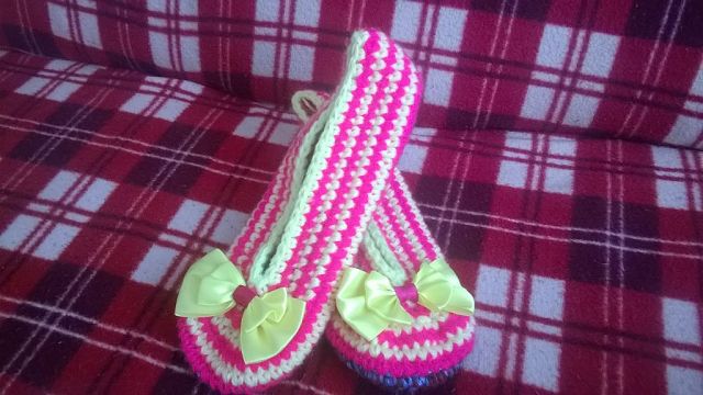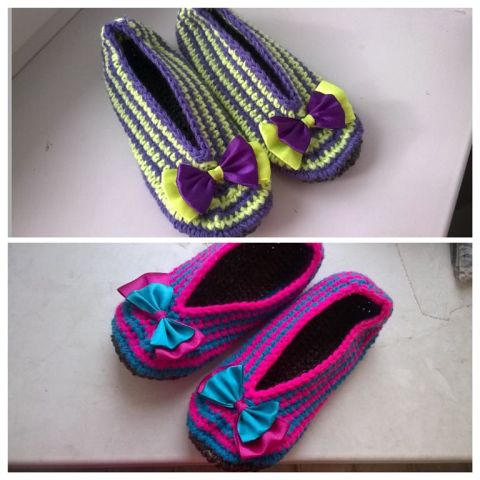 Они очень удобные!У меня вся семья их носит.Очень теплые.Вяжу в две нити,поэтому получаются плотные,а чтобы не слетали я в последних двух рядах,делаю убавку со стороны пятки.Подошва тоже вязанная.