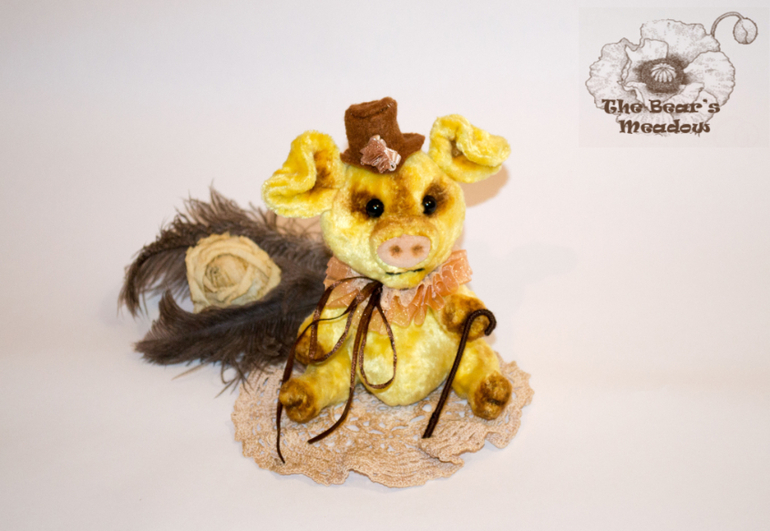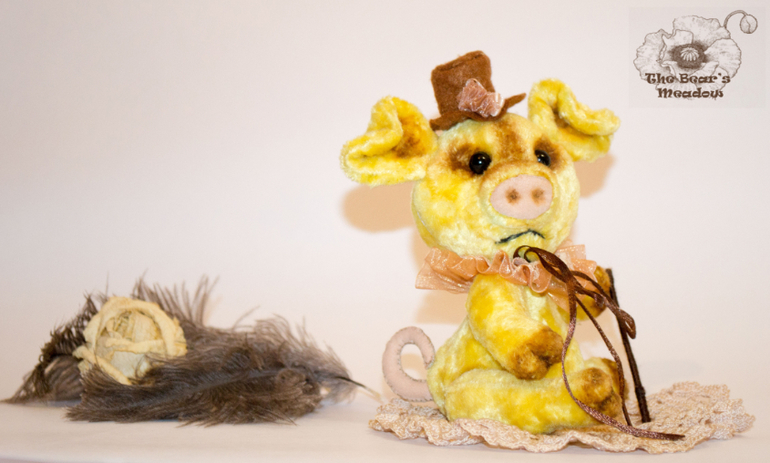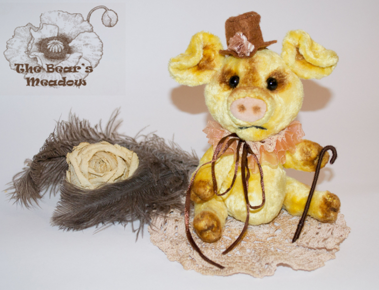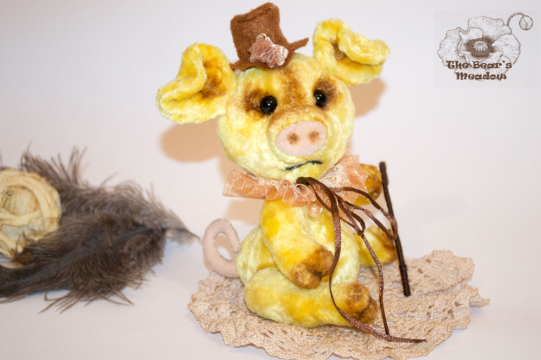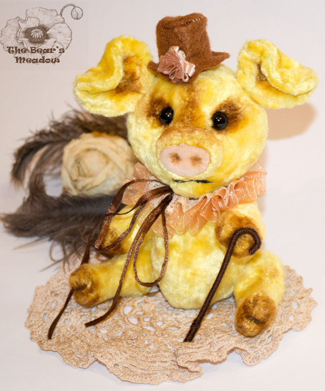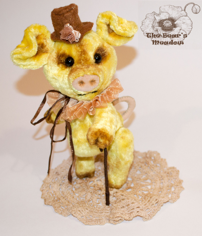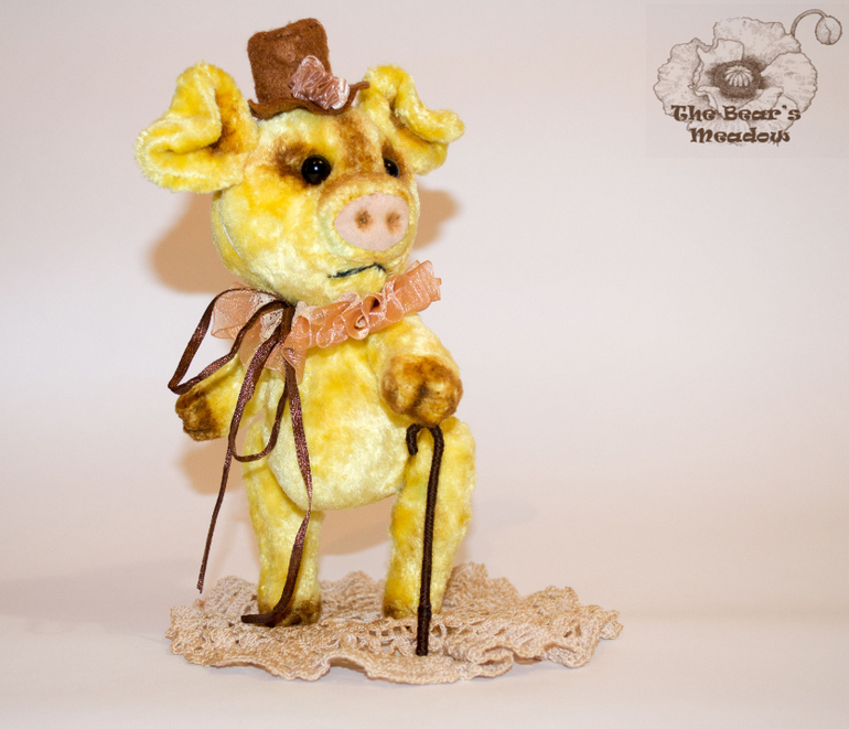 Пошит из старенького плюша, набит холлофайбером+стекляный гранулят, 5-шплинтовое крепление, пятачок и хвостик из замши, стеклянные глаза, тонирован масляной краской, аксессуары - фетровый цилиндр, воротник из органзы и кружева, моего окрашивания)))ну и как же быть мистером да без трости))))