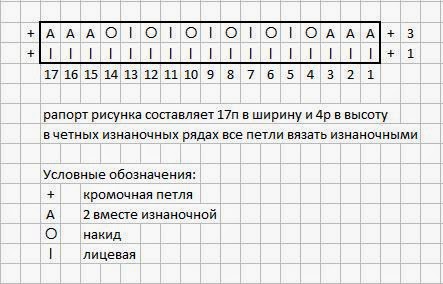 Далее разделила петли следующим образом: 6 п. жемчужным узором (планка для пуговиц), 1 лиц., 10 раппортов, 2 лиц., 6 п. жемчужным узором. и вязала по схеме. В 3-м, 19-м и 31 ряду сделала отверстия для пуговок.