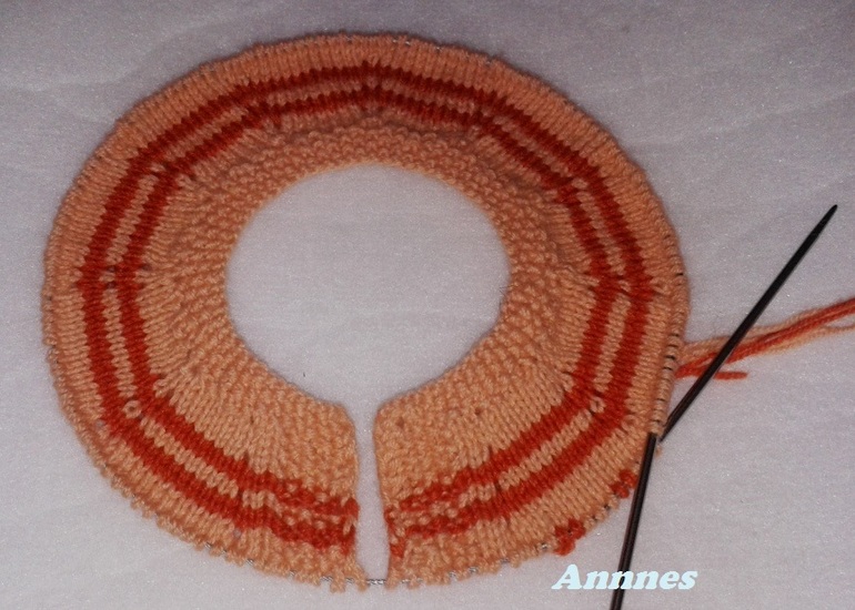 Далее перешла к отложенным петлям рукава. Набрав дополнительно 6п. из пройм, провязала 6 р. жемчужным узором.