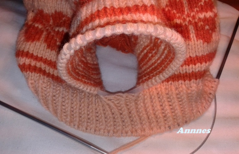 Далее продолжила вязание лицевой гладью, чередуя цветные полосы в произвольном порядке (=17 см). По боковым швам в каждом 10 р. прибавляла по 2 п с каждой стороны для небольшого расширения к низу. Низ закончила 4 см узором "Павлиний хвост".