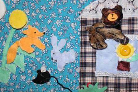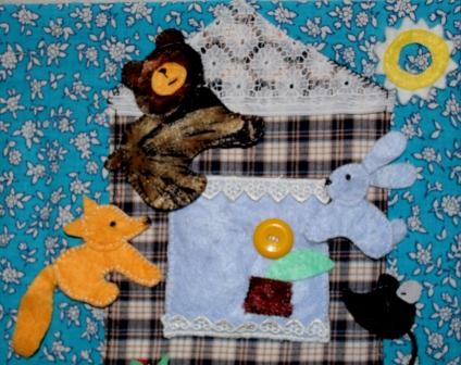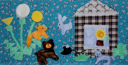 Летом попыталась сшить сыночку книжку, но швейной машинки у меня тогда не было, руками шить получалось медленно, ну и летом и так очень много всего) в общем книжку я не сшила, только одну страничку, и чтобы труд не пропадал зря, страницу приклеила на картон и теперь у нас панно) прошу строго не судить, это был первый опыт пошива фигурок, получилось не очень аккуратно, но сыну нравиться слушать сказку с этим панно