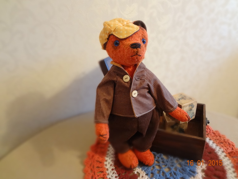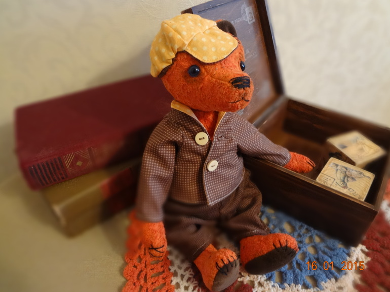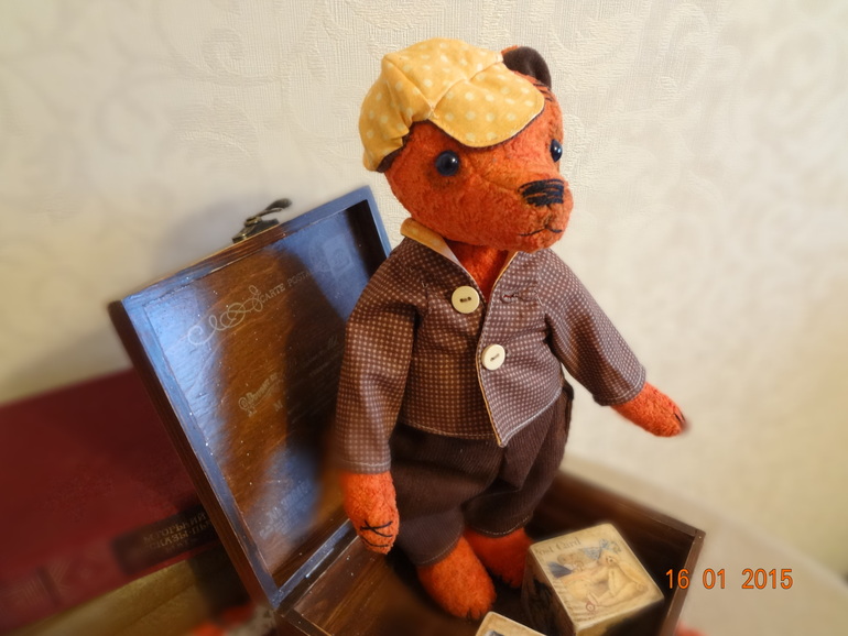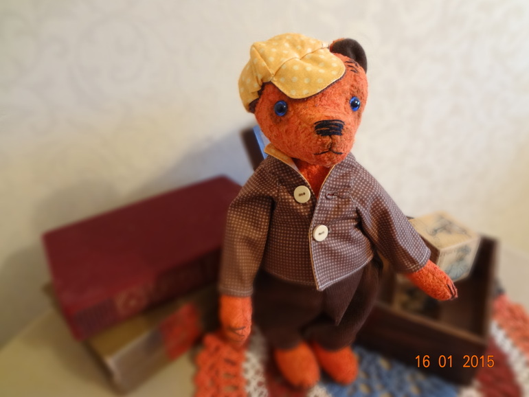 Игрушечный мир - животныеМишка тедди сшит из винтажного заваленного плюша,набит опилочками и утяжелен металлическим гранулятом. Шплинтовое соединение,голова,ручки и ножки подвижны. Глазки у Степушки небесно- голубые,стеклянные. Одет мишка в вельветовые штанишки,пиджачок из хлопка и кепку. Одежду при желании можно снять.Степушка сшит в винтажном стиле,немного заштопан и слегка тонирован масляными красками.