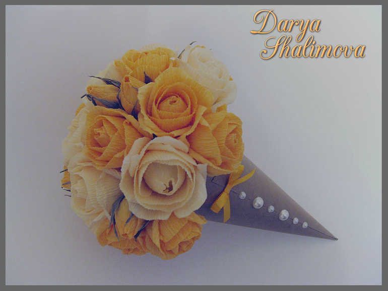 Букетик бюджетный нужно было сделать, так что по минимуму всего. Чашелистики оливкового цвета, но на фото серые получились((