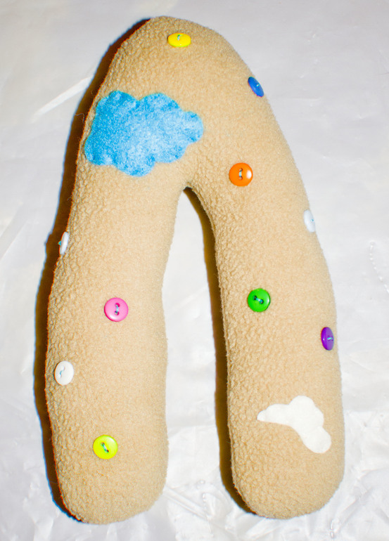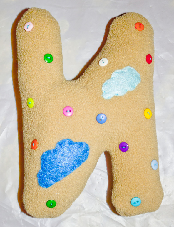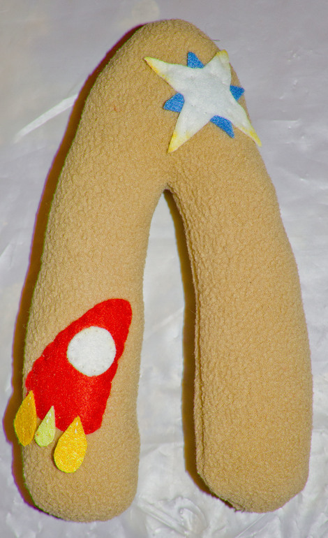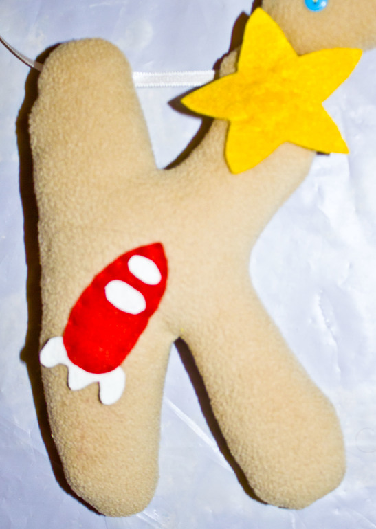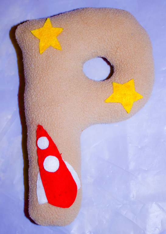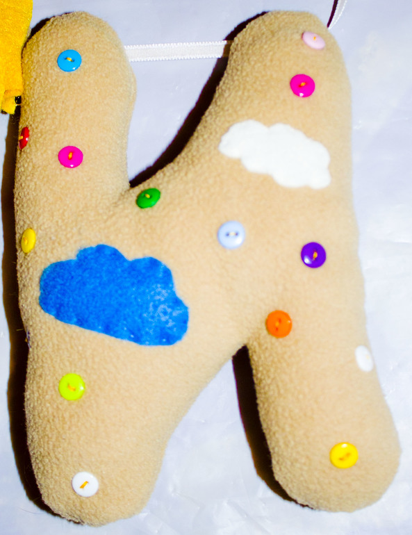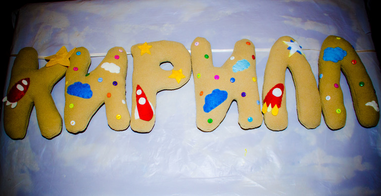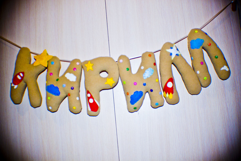 Мама просила мягкое имя, но не из фетра. Сошлись на флисе. Сами буквы бежевые, добавленные акценты из фетра (космическая тема - пожелание заказчика) и разноцветные пуговицы для дальнейшего изучения цвета.