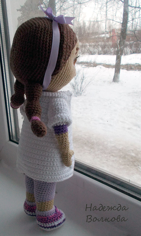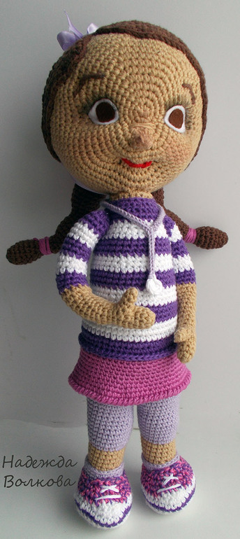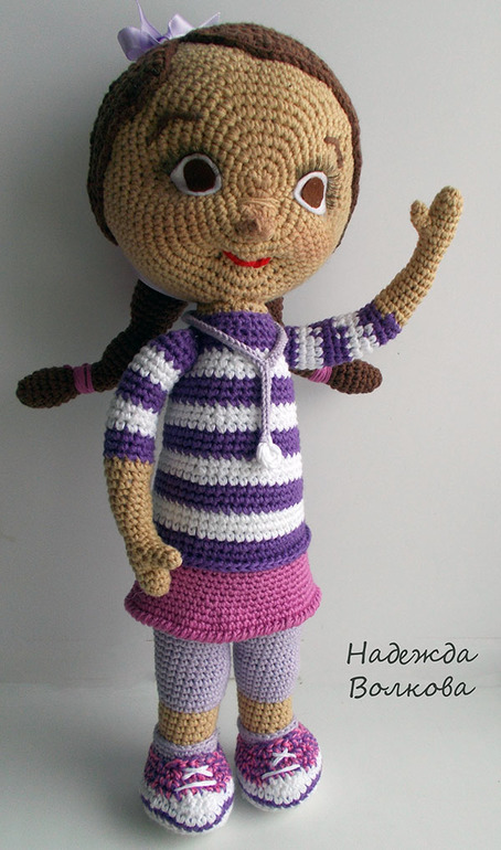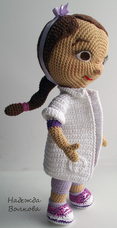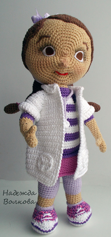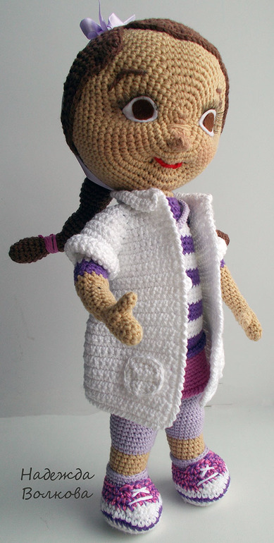 Связала для души, просто так) Хотела связать куколку по мотивам известного мультика про доктора Плюшеву, похоже или нет судить вам) Пряжа хлопок-акрил, крючок 2. Ростиком вышла 32 см, сама стоит, если попросить, руки хорошо гнуться (на проволочном каркасе), утяжелена, набита синтепухом. Съемный только халатик.