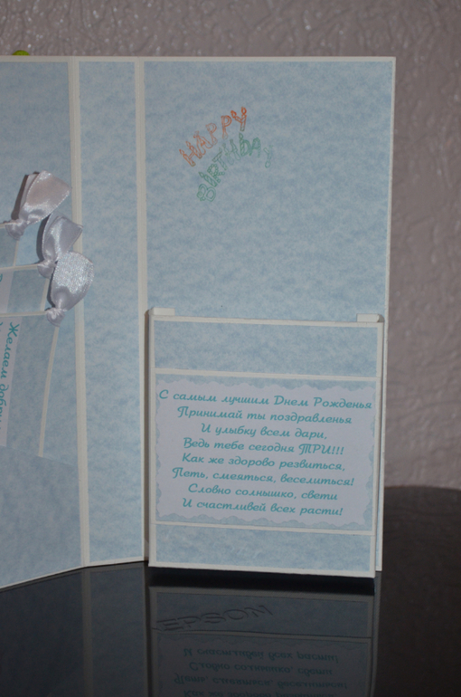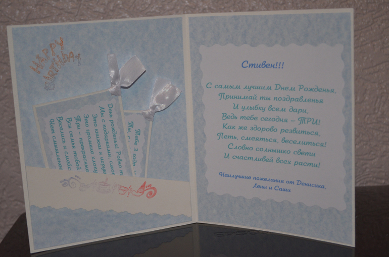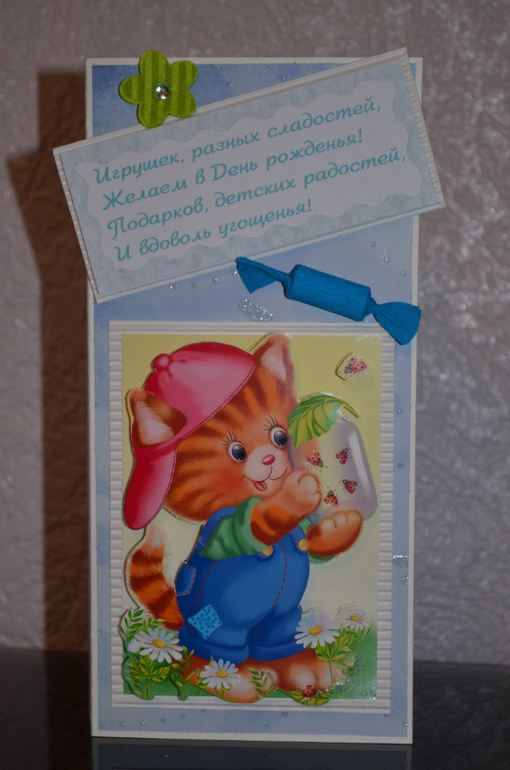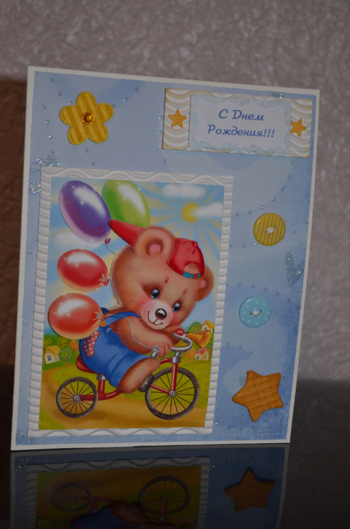 Это открытка двухгодичной давности. Ох, сколько я краски извела, распечатывая картинки, зато сделала их объемными))) Здесь даже звездочка фактурная из пластики моего производства