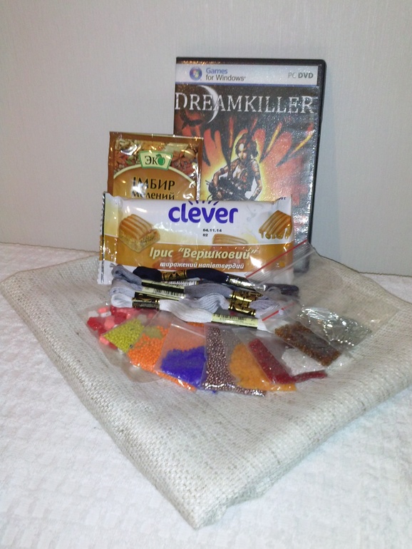 Вместе с тканью я получила ещё и вкусные ириски,имбирь, ниточки(до сих пор поражаюсь как иногда угадываются желания других,как раз хотела прикупить серую гамму для мишек тедди),бисер 7-и цветов,белую рубку(ей уже найдено применение))) и красивенькие бусинки-цветочки(мозги уже шевелятся,нужно с ними срочно что-то сотворить-они классные!!!) И ещё игра ,для сынули.Натусь,ты мне испортишь ребёнка