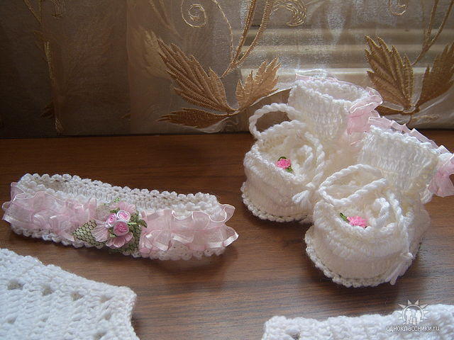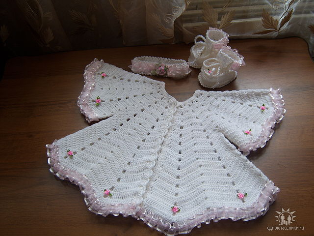 Очень красиво! Особенно понравилась розовая пушистая кофточка и белое платьице! Ребенок в нем, наверное, выглядит как ангелок!))) Ваша мама большая искусница!