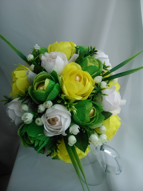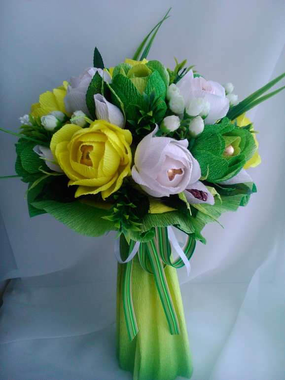 Сделала букетик для девушки,которая едет на свадьбу:предложенный вариант с розовым цветом был отклонен,ей хотелось желто-зеленого...