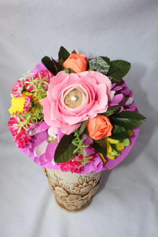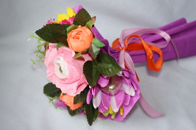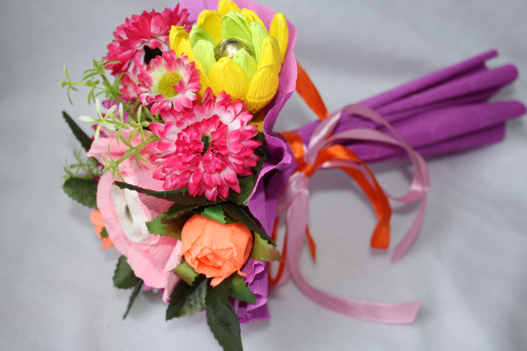 С тюльпанчиками мне очень нравится,форма цветочков отличная,только конфетки бы обернула в полисилк,или в цвет гофры,или золотого цвета конфетки,и для упаковки использовала бы лучше фетр или органзу,или сетку,просто саму гофру не люблю,по мне она простит букет,да и одна и та же структура выглядит не так выигрышно (в смысле цветы из гофры и упаковка из неё же),а во втором мне кажется,что сам букет небольшой,а цвета разного много,и розовый, и персиковый,и т.д.,можно над ним поработать.