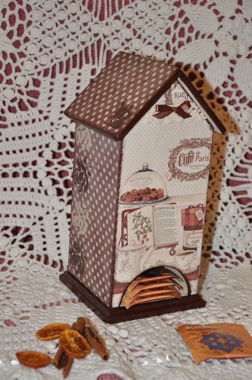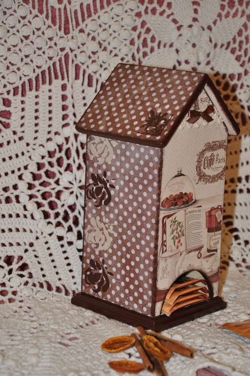 ДекупажЗахотелось сделать что-то шоколадное)) поэтому выбран такой дизайн для домика. Очень трудно делался. салфетка оказалась ужасного качества, долго мучилась с ней, несколько раз приходилось убирать и заново клеить, в итоге решила оставить только салфеточный перед. Ну что вышло, то вышло. Мне очень нравится эта карта в горох)