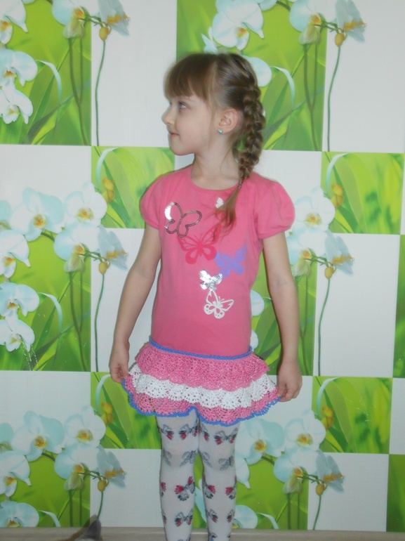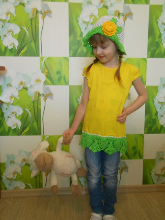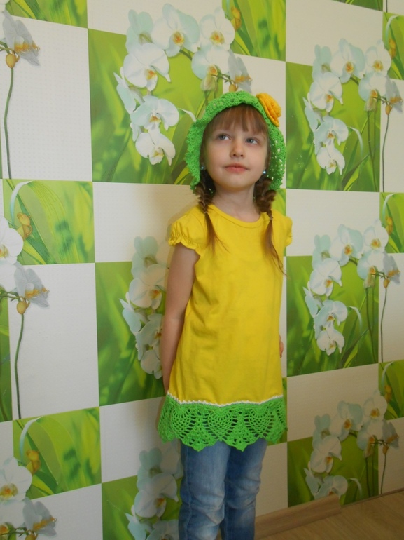 Ну и работы этого года: Сарафанчик и туничка тоже в комбинированной технике, футболка + обвязка крючком, ниточки остатки, в основной массе ирис, сосо, и ещё что-то без этикетки:-))