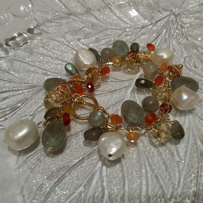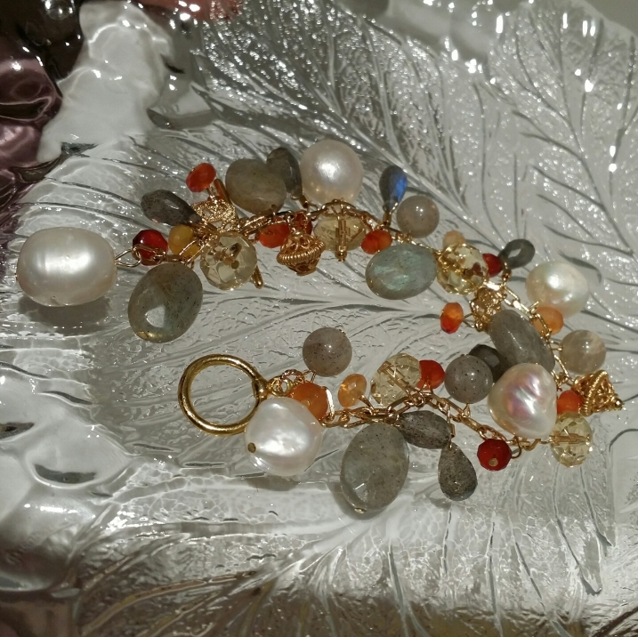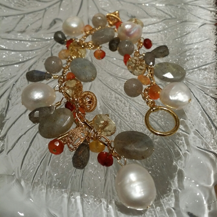 Собран на цепочке вермейль с прекрасным сочетанием белого барочного жемчуга, трёх видов лабрадорита с прекрасной иридизацией, крупного гранёного цитрина и невероятно вкусного сердолика медово-коньячной гаммы.