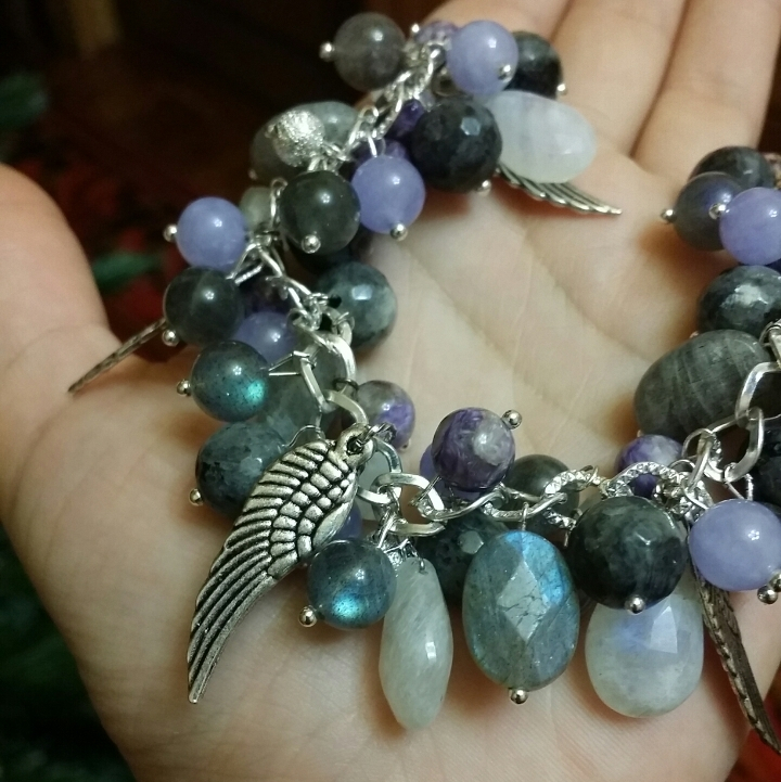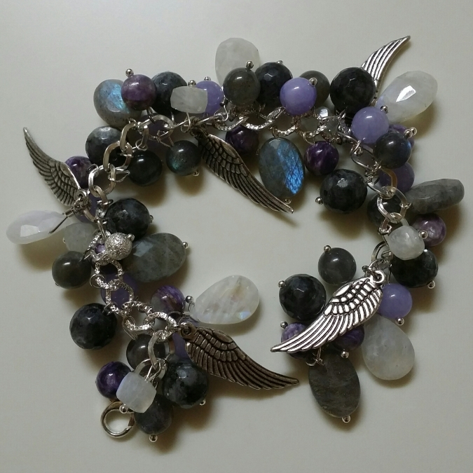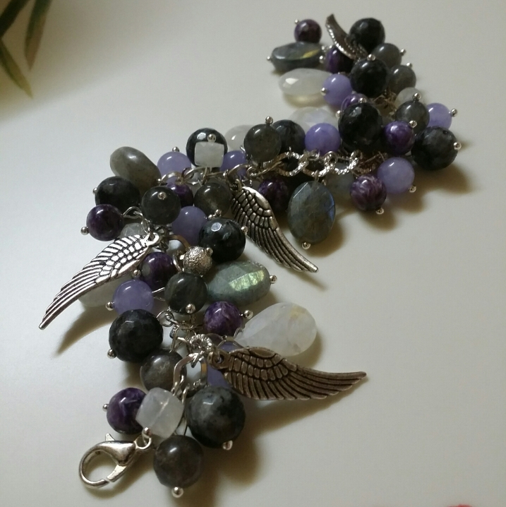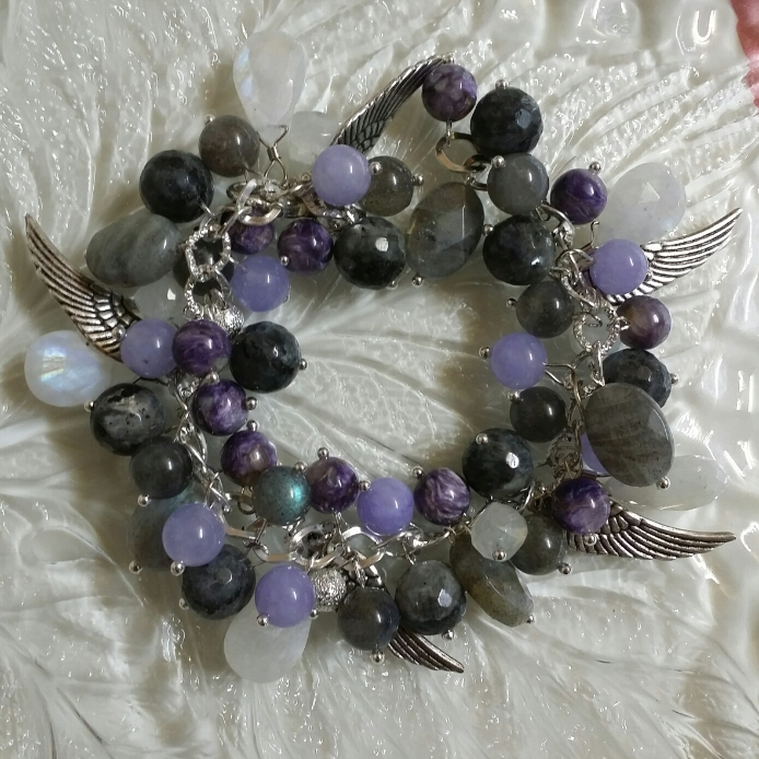 Снежная королева собрана из россыпи спектролитов на серебряной цепочке с красивым фасцетом. Все камни: лабрадорит, чароит, ларвикит, лунный камень адуляр и аметист с ювелирной огранкой.
