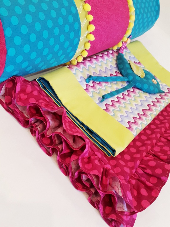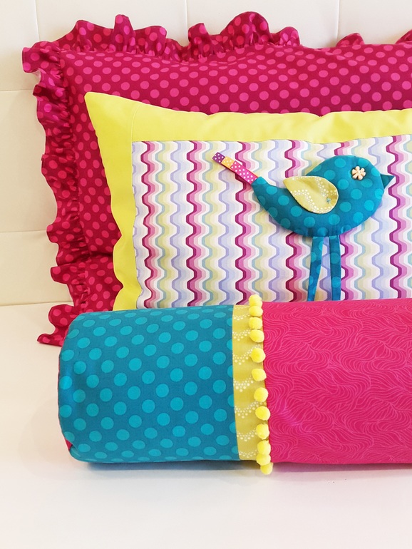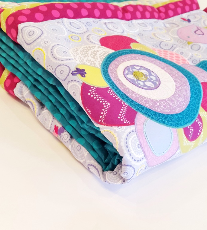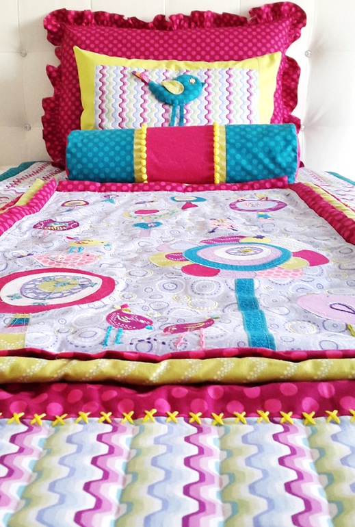 Вот такой сочный комплект, состоящий из покрывала и трех декоративных подушек, получился для маленькой непоседы))) Думаю ей будет интересно разглядывать, да и просто валяться на этом покрывальце в обнимку с подушками)))