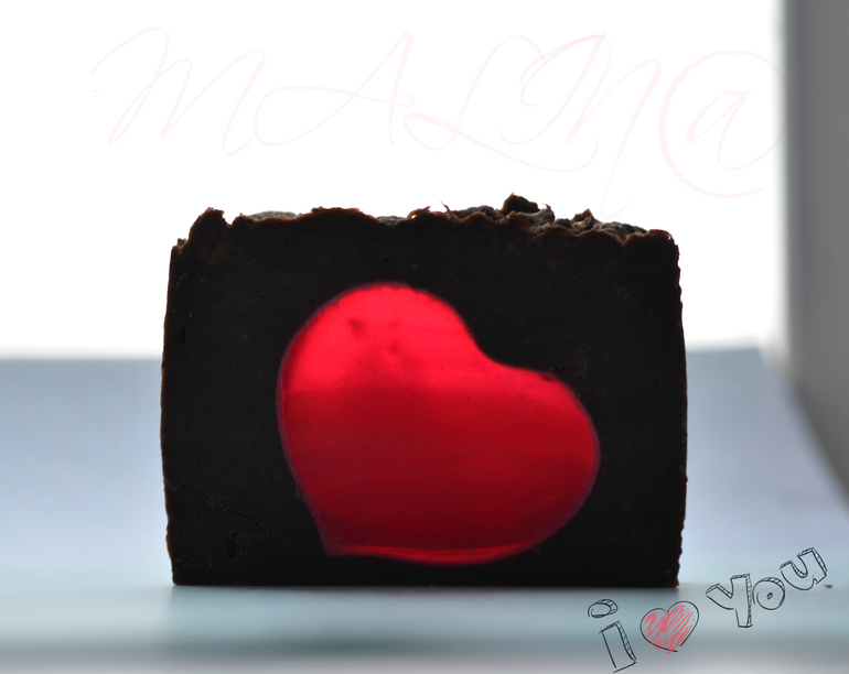 Два в одном! Здесь два вида мыла - глицериновое и шоколадное. сердечко - это натуральное глицериновое мыло. Коричневая часть - это натуральное шоколадное мыло приготовлено на крепком отваре кофе, отваре овсянки льна. с добавкой в качестве деликатного скраба из молотых кофейных зерен и молотого темного льна. Темный цвет от тертых какао бобов. Аромат Волшебный! )))