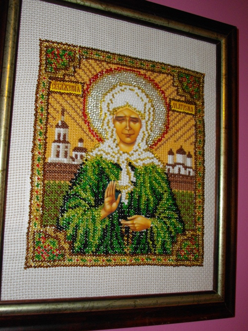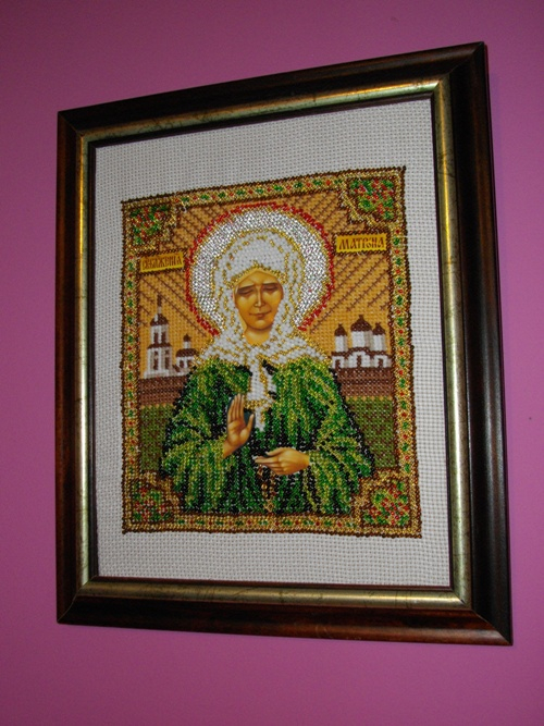 Спасибо огромное!))) Это Марья Искусница набор. Но там бисер очень неоднородный, мне не очень понравилось. Благословление не брала, т к лик в этом наборе не вышивается, это просто вышивальная работа с изображением Матронушки, это не икона. Но освятить работу в церкви хочу.
