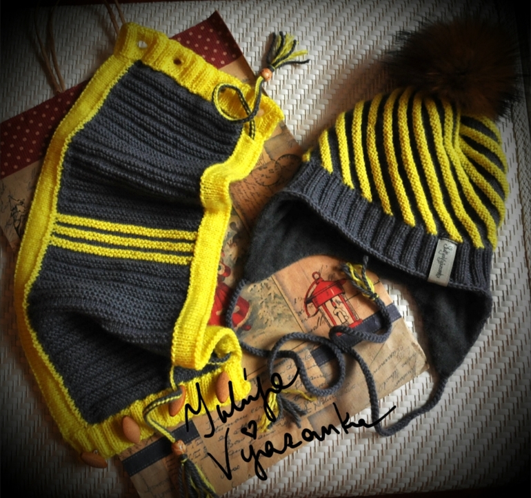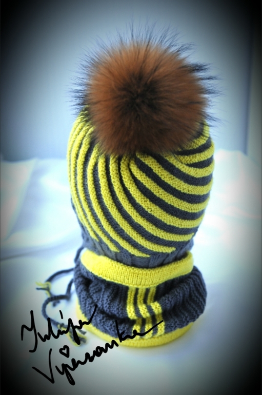 Шапочка утепленная (тонкий импортный флис), затылочная часть удлиненная (+2см), снуд на кулиске и пуговицах, помпон из натурального меха съемный (в данном случае на пуговке и петле-резинке). Комплект расчитан на весну/осень либо теплую зиму.