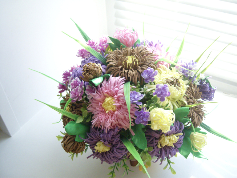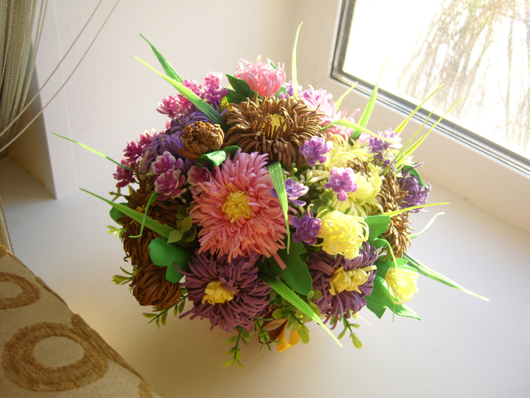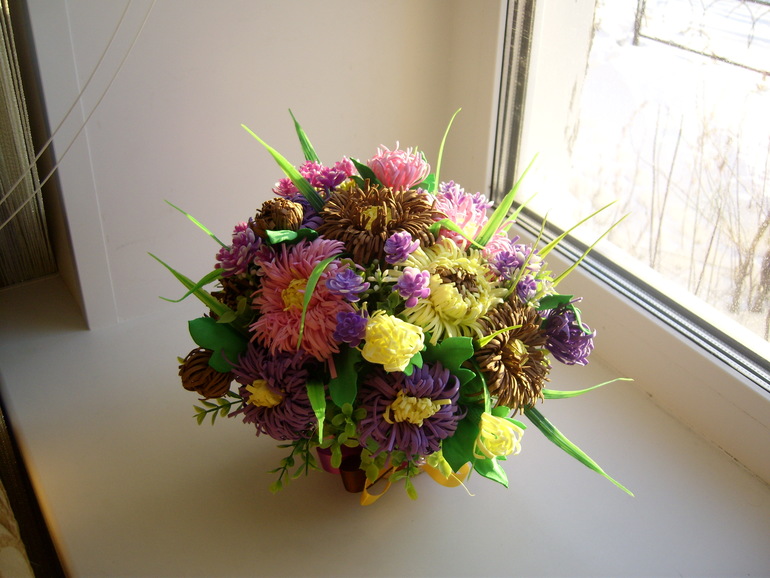 Катя красиво получилось! У меня вот никак не получаются астры. Это сколько же ты дней делала букетик? Слушай а маленькие цветочки тоже фом?