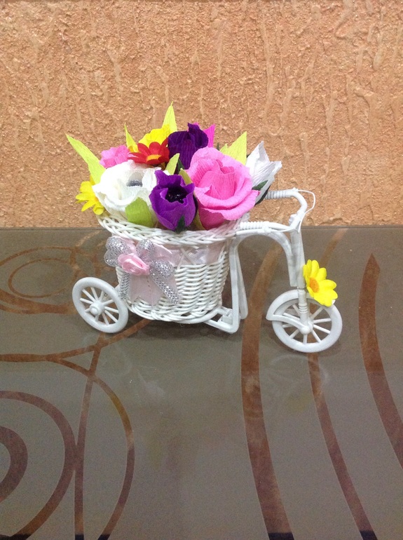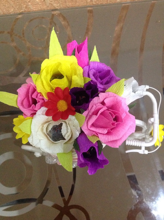 На мой взгляд, конфетки чёрные спрятать получше, все цветочки приподнять, особенно в середине. Салатовые стебли убрать, вместо них иск.листья и мелкоцвет, тогда будет ок))))