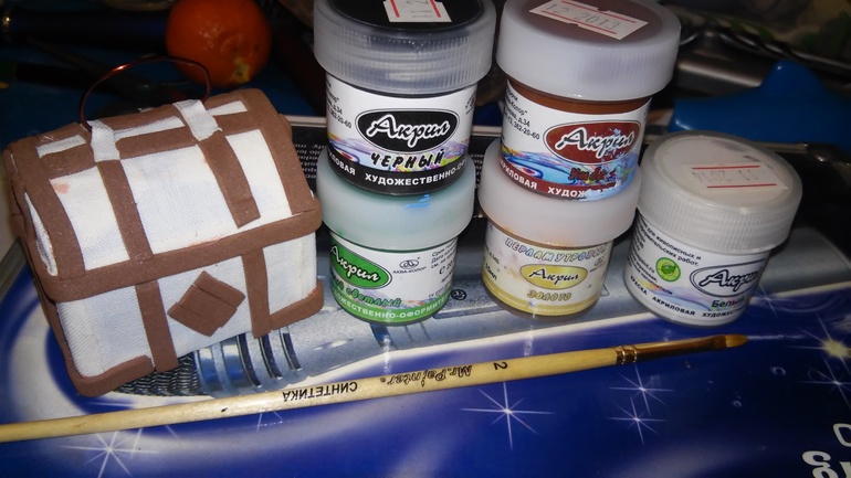 спасибо,Тнюша) Ты мне льстишь)Самого Кузю вот по этому МК делала. Ножки у него текстильные,вязаные только лапти)Сундук да сама придумала,сама сделала,сфоткала,поделилась))2 часа работы пока Настя спала)Краска акриловые-это супер. Она не смываются после высыхания,дает яркие цвета,рисовать ею круто)) можно с детками. Ее можно наносить на ткань,дерево,пластмассу,керамику и тд.Сохнет быстро!Стоит 1 баночка 33 р у нас,набором (6 цветов)250 р