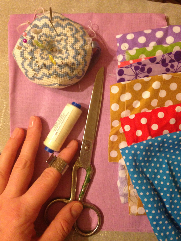 *ножницы, булавки, игла, нить нейтрального(бежевого) цвета, или другого.. если например, вы будете сшивать разные оттенки розового, то лучше взять розовую нитку, а у меня пестрота.. на фото у меня еще нитеобрезатель или как его там называют ) на пальце, он не обязателен совершенно, просто хотела показать что такое бывает)) удобен, когда надо часто обрывать нить, а за ножницами тянуться неудобно