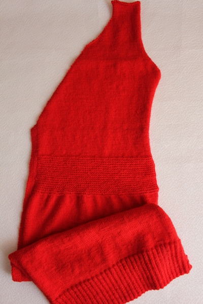 Затем переходим на платочную вязку, для приталивания в каждом втором ряду равномерно убавляем 1*12, 2*6, 1*3, затем вяжем прямо еще 28 рядов.Снова переходим на лицевую гладь, равномерно прибавив во втором ряду 8 пет. С левой стороны полочки вяжем прямо 24 ряда (начиная с первого ряда лицевой глади после платочной вязки), затем убавляем в каждом втором ряду 34*1, 4*2, 10*1. Затем провязываем прямо 15 рядов. С правой стороны полочки вяжем, выполняя прибавления аналогично спинке, пройму рукава выполняем так же, как и на спинке. Оставшиеся петли закрываем.